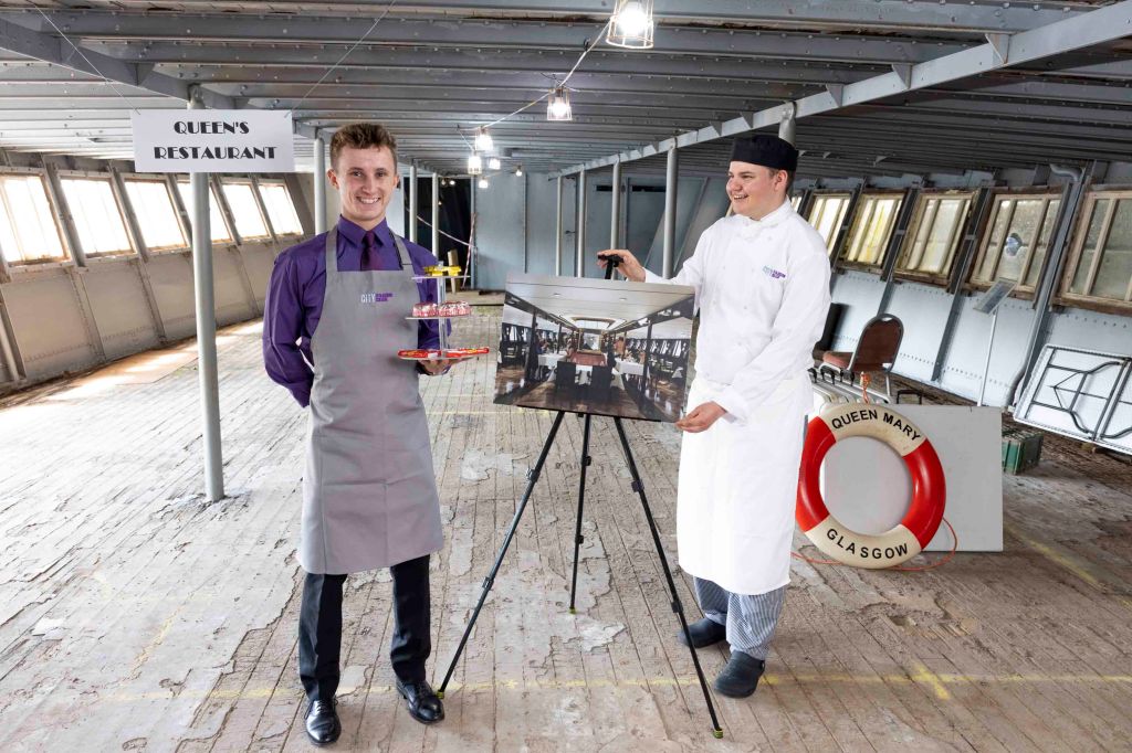 After last months nautical theme I was back on the high seas, well Princes’s Dock in Govan Glasgow for a new training initiative between City of Glasgow College and the TS Queen MaryThe college and the Friends of TS Queen Mary, the charity behind the restoration of the historic steamship will provide training and employment opportunities on board the ship for students wishing to enter the hospitality industry. I photographed Paul Little, Principal and Chief Executive of City of Glasgow College and Iain Sim, Chair of Friends of TS Queen Mary with a couple of the college students. Afterwards we went down below deck and into the Queens Restaurant, which in its day would have been the last word in luxury. I thought a picture of the students Alex Dick and Robbie Maitland in the soon to be refurbished space brought together the past and future. The tea and biscuits tasted great too.