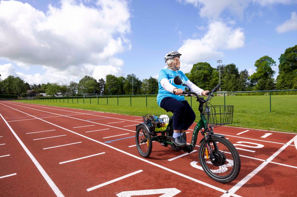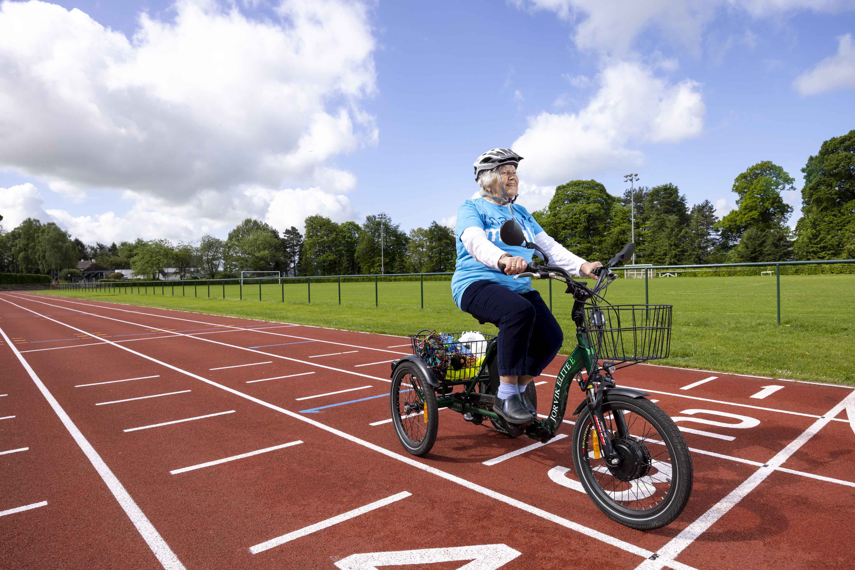 I met an amazing lady up at the University of Stirling. Great grandmother Ellison Hudson, from Bridge of Allan, was celebrating her 84th birthday by cycling 84 miles around the University’s racetrack. She was helping to raise money to help feed some of the world’s poorest children with Mary’s Meals. She has been a fundraiser for the charity for many years. She gave me shot of her tricycle. It’s an electric one and takes a bit of skill to use it. It nearly took off with me, until I got the hang of controlling it.