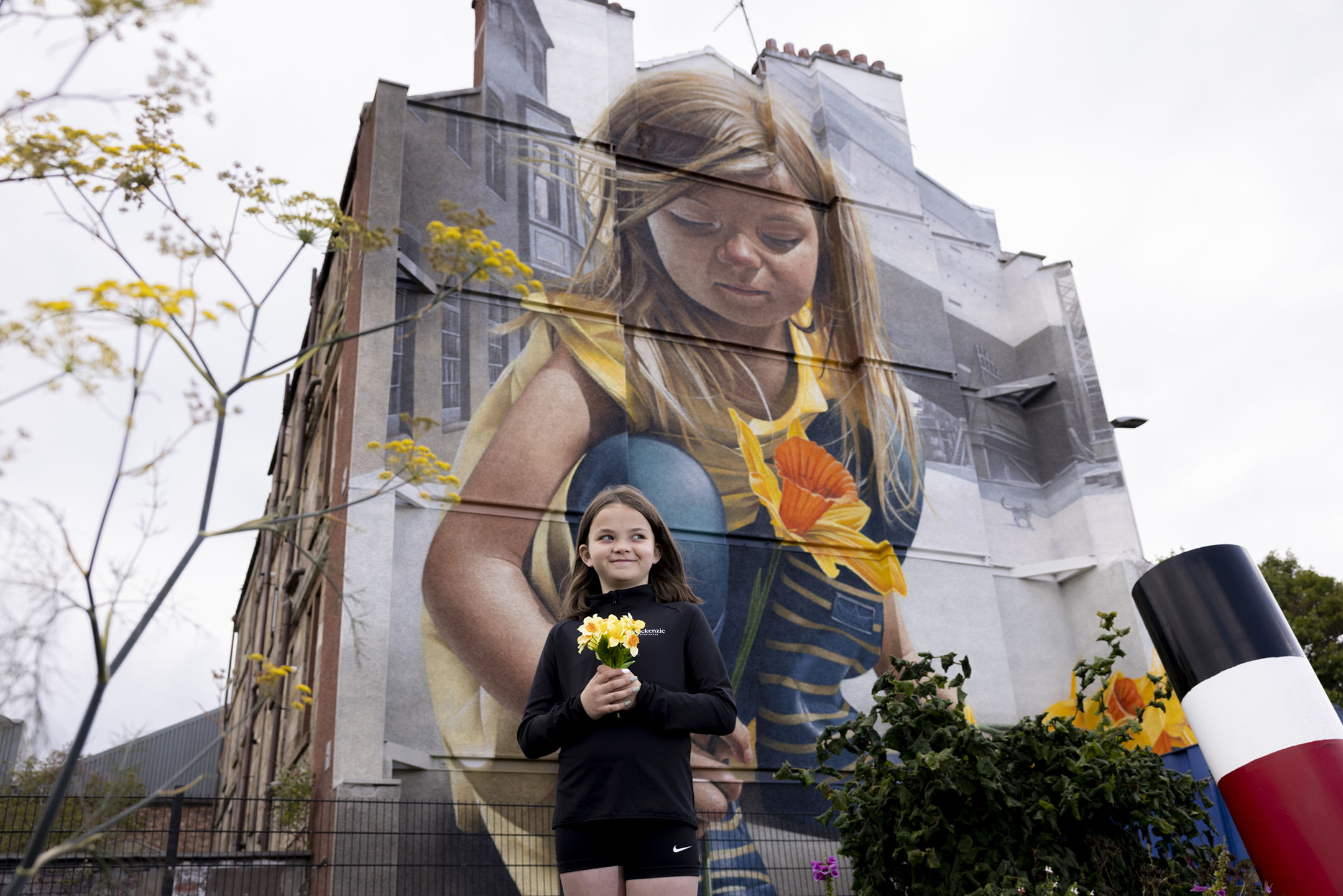 I love all the huge murals that are dotted around Glasgow City centre. I had an assignment to photograph striking new artwork celebrating life in Glasgow’s Govan area. It had been commissioned to mark the 50th anniversary of Govan Housing Association. The fantastic tenement mural on the city’s Govan Road was created by celebrated street artist Sam Bates , better known as “smug”. The artwork shows a young girl bending down to pick a daffodil. We had local youngster Annie who posed with her own daffodils to mimic the giant artwork. The mural has now been named Georgie in a tribute to one of the Govan Housing Association’s long serving management committee members Georgie Hay. Sometimes photographing artwork in this scale is not as straightforward as you would think. A very wide angle lens is needed and a small aperture to get the subject in front in focus as well as the building.