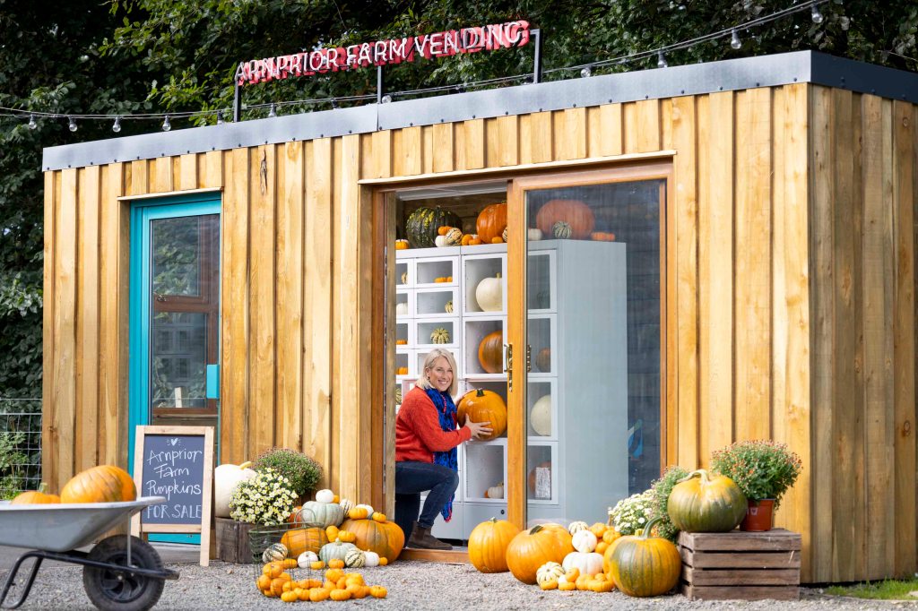 I love halloween, not the scary movie part but the dooking for apples, getting dressed up and pumpkins. Every year I look forward to a trip to Arnprior Farm, Scotland’s premier pumpkin patch. All geared up for Halloween 2022 they had a new a one of a kind new addition. As well as the usual bumper crop of over 15,000 pumpkins, this year, the team unveilied Scotland’s only pumpkin vending machine. Farmer Rebecca McEwen showed me how easy it is to use and the hot chocolate and coffee machine just as the side of it. It’s ideal for someone like me who doesn’t want to get all muddy. I know the kids love mud but not me so much.