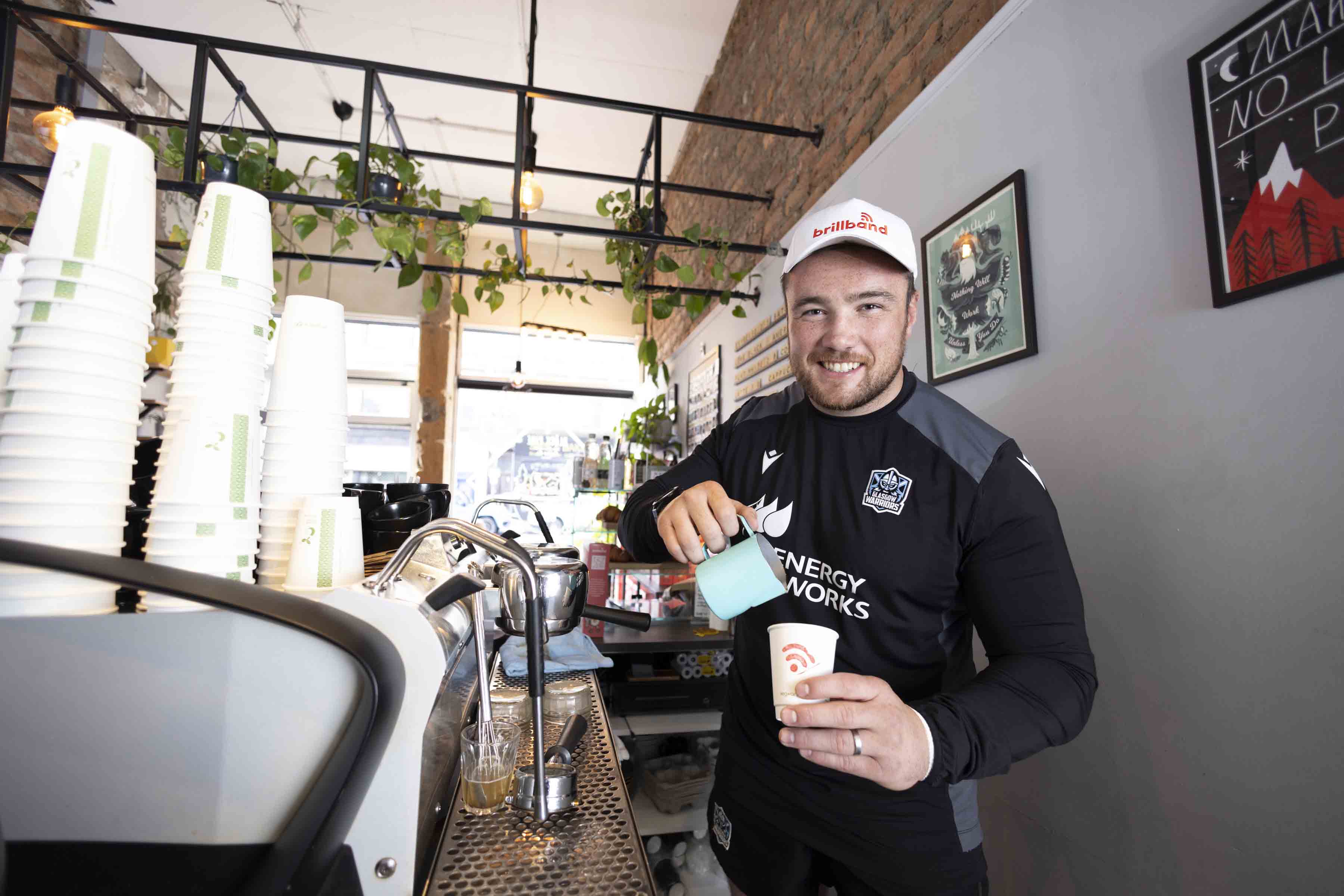 I am never one to refuse a coffee. So when an assignment came up to photograph Zander Fagerson of the Glasgow Warriors at Brillbeans, the west end of Glasgow’s first ever cereal bar, popped up at Black Pine Coffee on Great Western Road I jumped at the chance. The Glasgow Warriors and British and Irish Lions rugby star had swapped scrummaging for serving lattes at the for one-day- only pop-up cereal bar to mark the upcoming launch of Scotland’s newest broadband start-up. Brillband had recently announced its sponsorship of Glasgow Warriors for the upcoming season ahead.