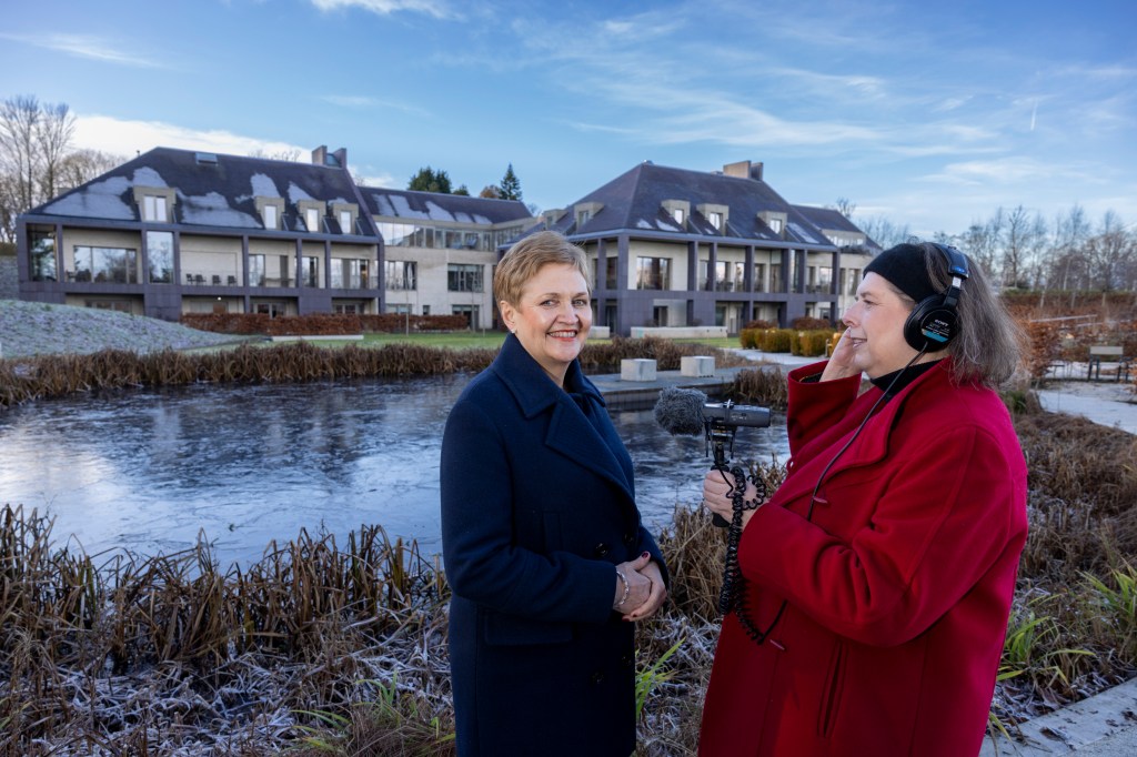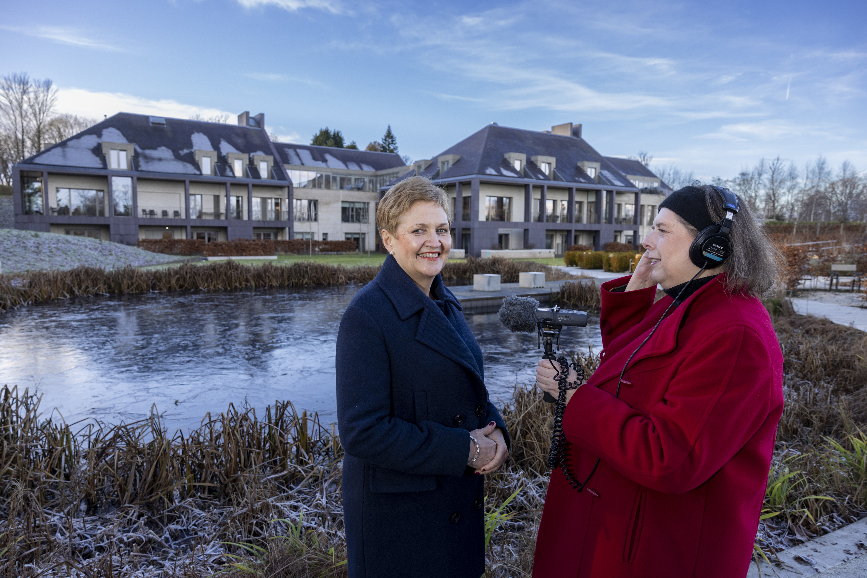 I have had many assignments at the Price & Princess of Wales hospice however this was my first photo call that involved recording a podcast. I met Pauline Moore, host and producer of ‘Dear Green Place’ podcast with Rhona Baillie, Chief Executive of The Prince & Princess of Wales Hospice in the hospice grounds. I wanted to show the lovely winter scene while they recorded the everyday things happening in the hospice. The lake in front of the building looked lovely in the winter sun.