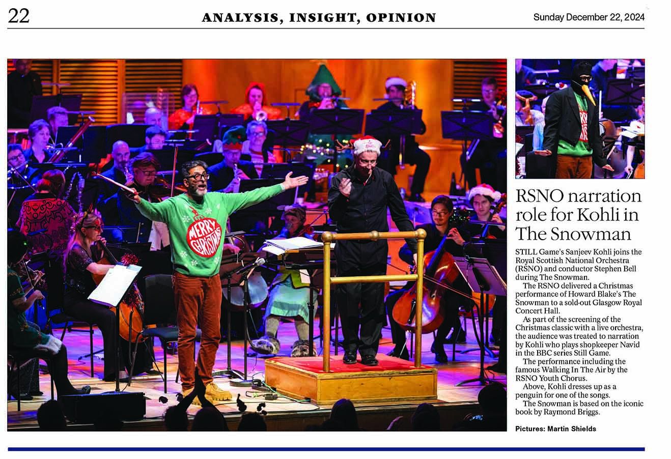 My last assignment of the year of the year was The Snowman movie with that lovely soundtrack performed by the Royal Scottish National Orchestra. My favourite bit was the RSNO junior chorus singing Walking In The Air. Still Game star, Sanjeev Kohli, was brilliant narrating the story. After the first half of the concert the orchestra come back on stage all in tinsel and Santa hats for the second half. This time Sanjeev Kohli got dressed as a penguin for The Penguin Song. The audience were all doing the penguin Dance along with him. Great fun! It got a super show in The Herald on Sunday as well as The Sun & Scotland on Sunday.