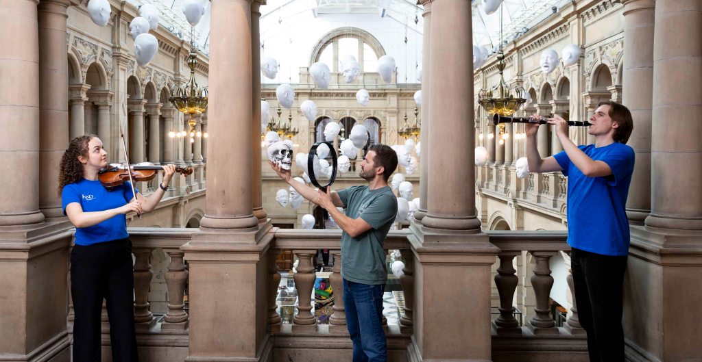 Another musical event I love to do is the Children’s Classic Concerts with the RSNO. This year’s children’s concert , A Fright at the Museum was held at Kelvingrove Art Gallery & Museum. Presenter percussionist Owen Gunnell (centre) was with RSNO musicians Veronica Marziano & William Knight. It was such a good idea to use the gallery as a location. I loved all the heads floating in the air as Owen looked the scull with a giant magnifying glass. We did get a few looks.