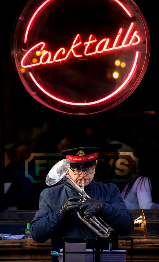 There was the usual scattering of buskers singing festive hits but by far my favourite was the Salvation Army brass band. It is an emotional sound, so festive. They were playing outside TGI Friday’s. I did like the picture of the horn player in the window with the cocktails sign in the window.