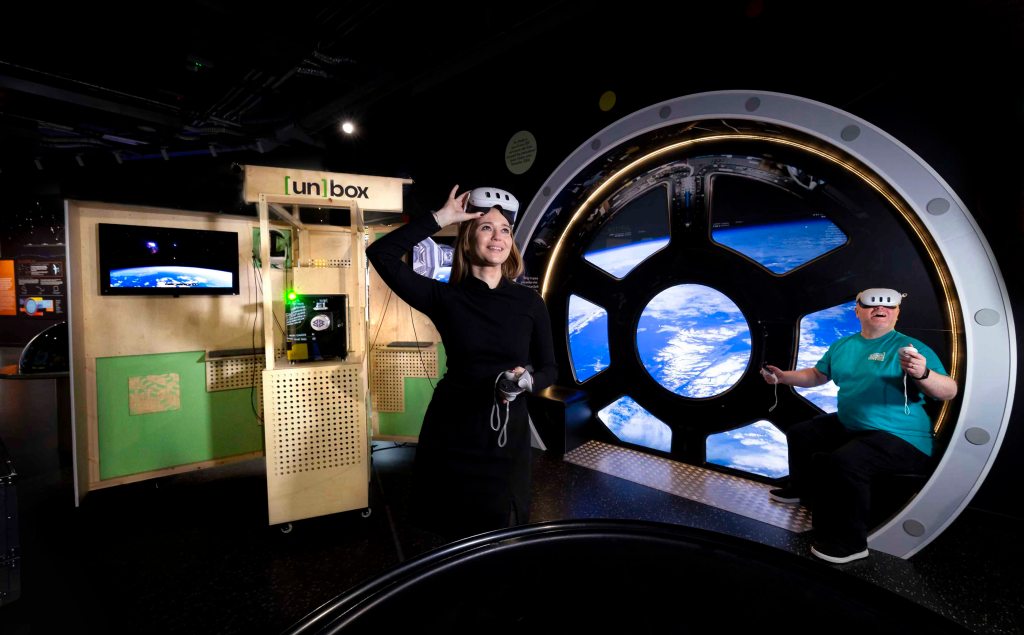 Imagine visiting a museum and being transported to go anywhere and virtually examine artefacts at astonishing proximity and from every possible angle. I was so pleased to be asked along to see The University of Glasgow’s [un]box Virtual Reality kiosk, a self-contained gateway to worlds that were once out of reach. Being a Star Trek fan the thought my picture should be from outer space would get my creative juices flowing. I wanted to take the picture beside the model of the viewing platform on the space station. I was with Dr Lynn Verschuren of The University of Glasgow Museums in The Metaverse Team and Derek Shirlaw of Glasgow Science Centre. They laughed when I said I had a fear of fear of heights.