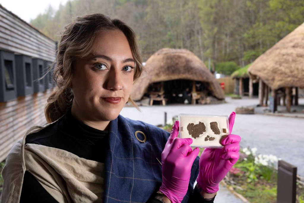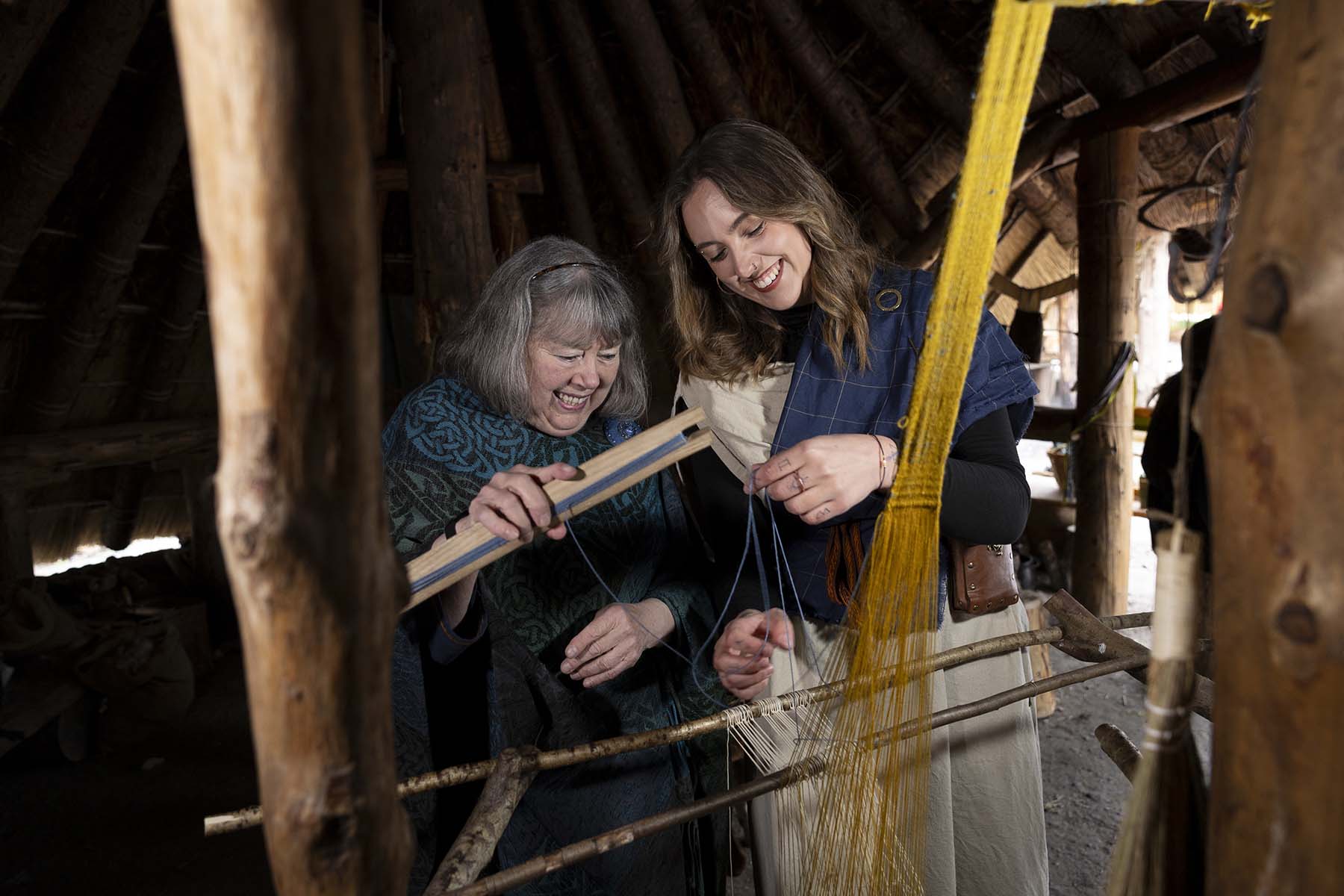 Isobelle and her co – experimental archaeologist Maureen Kerr are pictured the roundhouse using a warp-weighted loom to recreate the 2/1 twill weave found during the excavation of Oakbank Crannog in 1979 in Loch Tay in Perthshire.