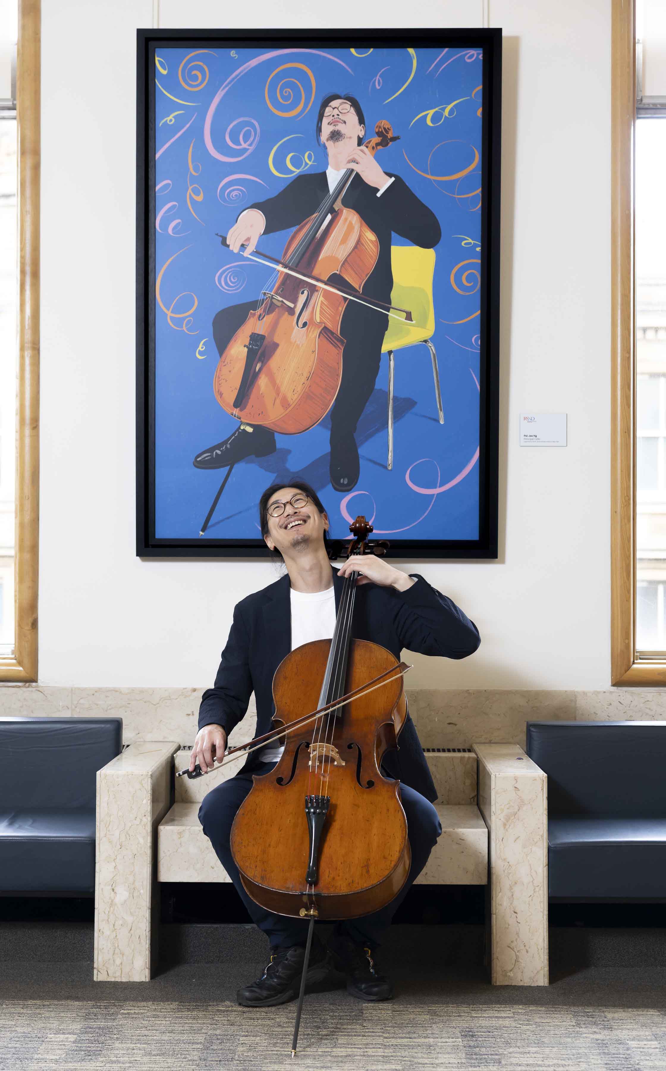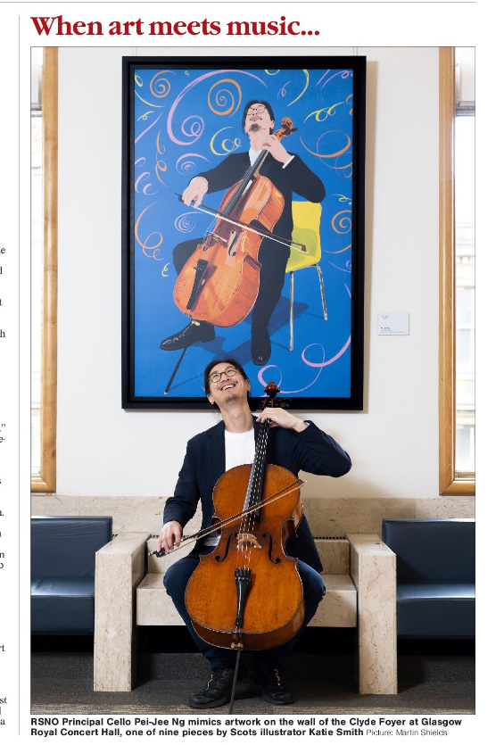 To illustrate the RSNO’s musicians in her signature colourful style, Glasgow-born Katie was given open access to a range of rehearsals and concerts. Using the individual characteristics of the eight selected musicians and Music Director Thomas Søndergård, she aimed to bring a sense of movement into the portraits. My favourite was the picture of Principal Cello Pei-Jee Ng, who I got to replicate his picture position in the photograph. He ended up on the front page of The Scotsman and in The Herald too.