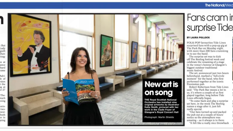 I love going to concerts also art and photography exhibitions. So I was delighted to be asked to cover the opening of an exhibition of artworks by illustrator Katie Smith in the Glasgow Royal Concert Hall’s Clyde Foyer. The Royal Scottish National Orchestra (RSNO) have installed nine original artworks by the Scottish illustrator. Music Director Thomas Søndergård and the RSNO musicians featured in the illustrations came along to see their images. They all looked fantastic. They had with their supporters who had all given generously via the Orchestra’s Chair Patron scheme. The RSNO Chair Patron programme supports the vital and extensive work of the whole organisation and enables individuals, trusts and corporate organisations to build meaningful and impactful relationships with RSNO musicians.