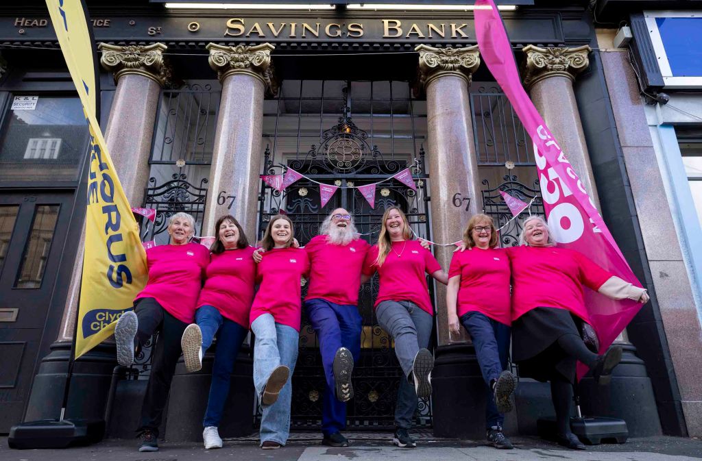 I met a fab group of Glasgow 850 volunteers outside The Savings Bank, one of the amazing Clyde Chorus Venues. As Glasgow was getting ready to host the Glasgow 850th celebration at the weekend, the volunteers were all sporting their new bright pink T shirts. One of them asked if I could do a picture of them all doing a high kick. I said that was one of our standard pictures of a big group back in the day on the Evening Times picture desk. It worked out brilliantly. They loved the laugh it produced … all the news outlets that used an image chose the high kicking picture. I think it is time to bring ‘the high kick’ back into fashion. It was suggested by Corrie Campbell who I was working with at the photocall.