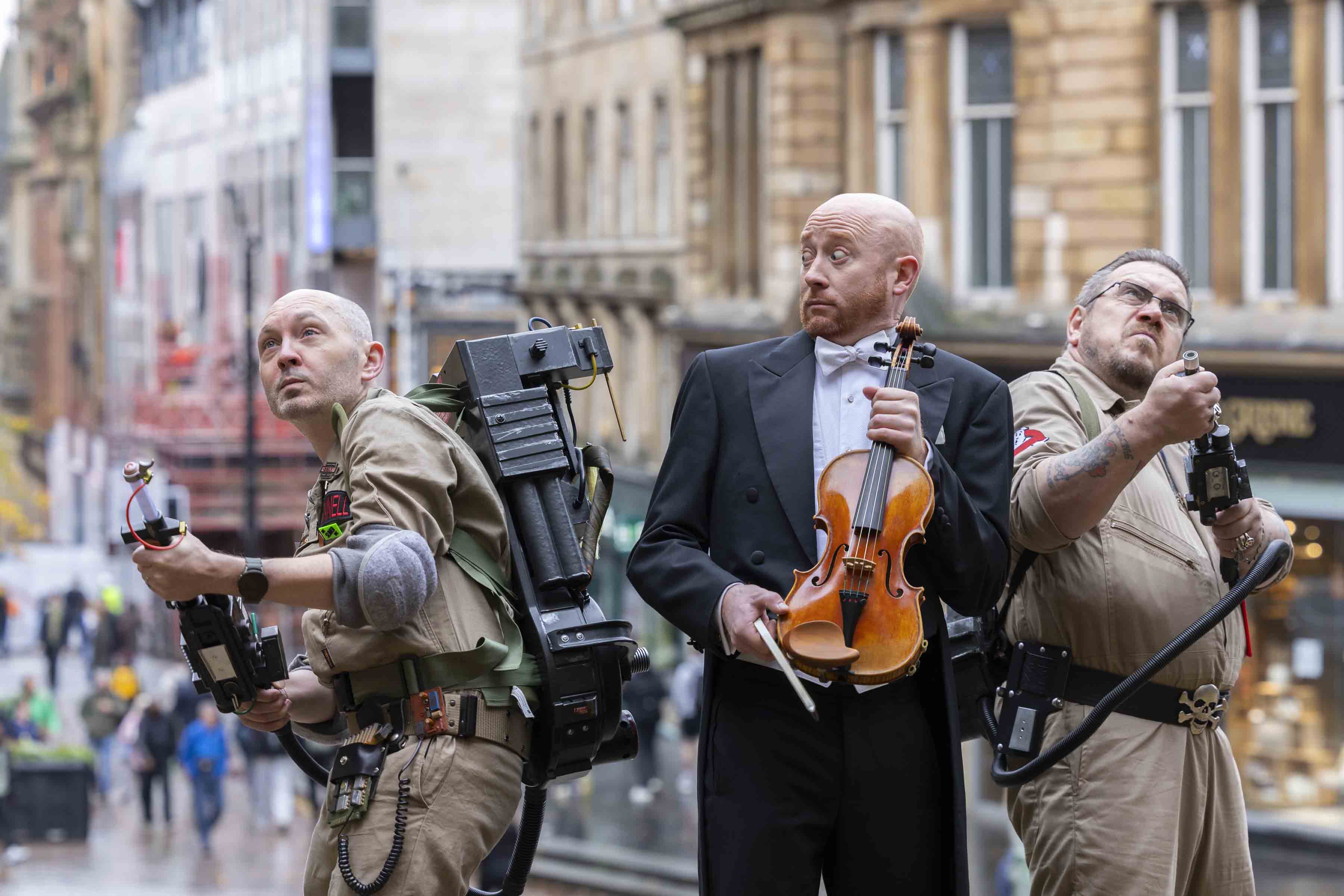I remember seeing Ghostbusters years ago. It was good and the sequel was good too. I always wanted to get a back pack on and go ghost hunting. I was delighted to be asked along with RSNO violinist Liam Lynch at the Glasgow Royal Concert Hall with the members of Ghostbusters Alba with full ghost busting equipment. The RSNO were bringing the original 1984 blockbuster Ghostbusters back to life for Halloween, performing the soundtrack live to the film in Glasgow and Edinburgh. It was another fab picture which ended up on the front page.