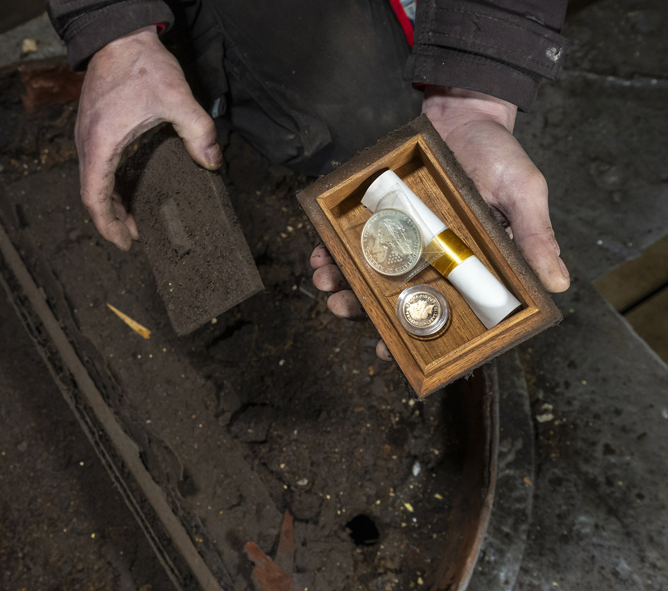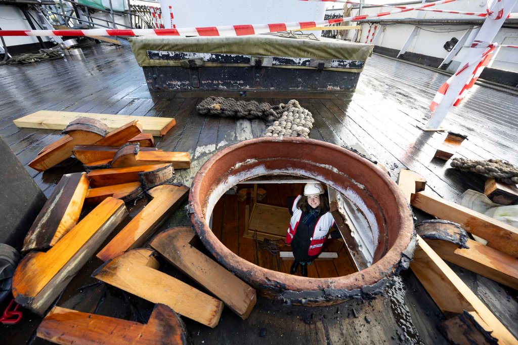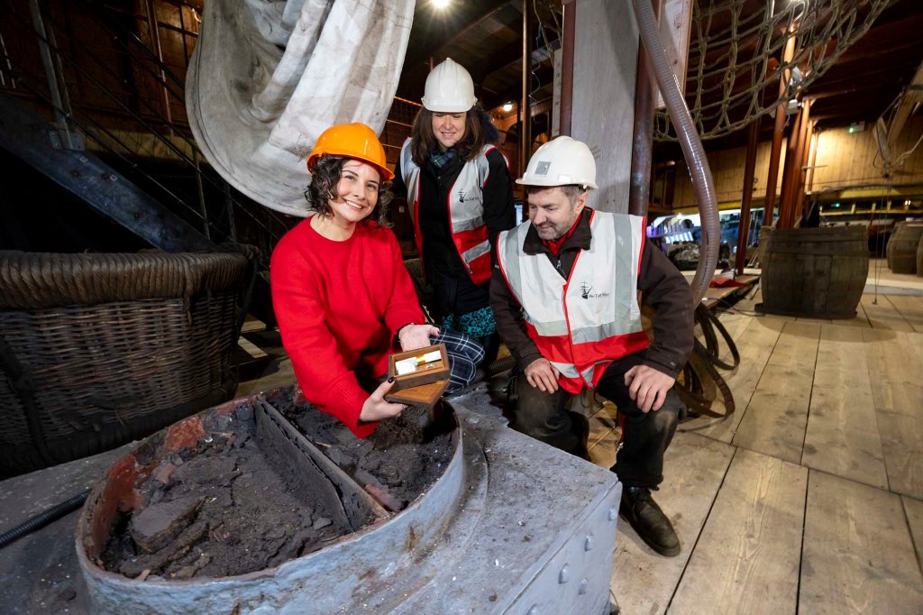 After the masts came out I managed to get on board to have a look at the spaces where the masts came from, as the ship now had two big holes where the mast were. Beneath the main mast, a small wooden box was found. It was ceremonially placed there in July 1998. Inside were a 1998 gold sovereign and a silver dollar, along with a scroll acknowledging the members of the Trust and Ship Committee who contributed to the restoration process. Also in the dirt and stoor below the mast a 10p coin was also found. It seems as the main ceremony solemn ceremony took place back then a ten-year-old Tom Gibson who stood proudly beside his grandad, Murray Scrimgeour, watching the mast being stepped. Suddenly realising he too had a shiny coin in his pocket, Tom threw in a 10p coin into the mast step, next to the official box. The whole week made for some amazing pictures and stories.