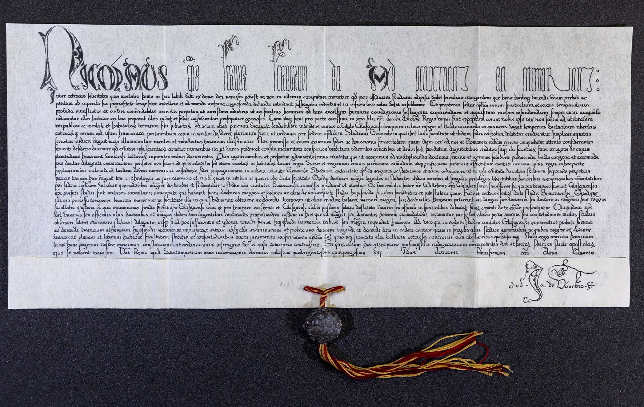 On the 7th January 2026 the University of Glasgow celebrated its 575th birthday and I was in the University archives with the new University’s Principal & Vice Chancellor, Professor Andy Schofield and archivist Michael Gallagher. They were looking at a copy of the Papal Bull dated 1490. The papal bull explains that The University of Glasgow was founded by Pope Nicholas V in a letter dated 7th January 1451 with an authenticated with a lead seal or `bull’. It was pretty impressive as was a newer 2001 copy of the Papal Bull created for the 550th anniversary of the University. I do find these things so interesting. It makes you think what Glasgow would have been like 575 years ago.